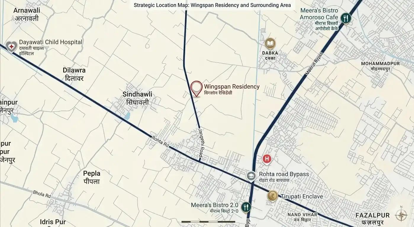 The Wingspan Residency Meerut location map shows the connectivity to the plots near NH-58 Meerut and also the nearby schools, hospitals, and markets as well as other key city areas, which makes it perfect for residential living and also for investment.